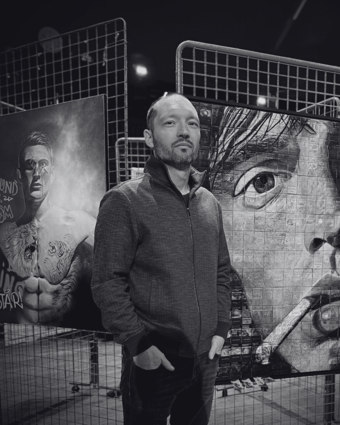 L’œuvre de F1000 détourne un objet du quotidien pour en révéler toute la complexité symbolique. Assemblés en mosaïque, des paquets de cigarettes recyclés deviennent le support même de la peinture — un geste fort, à la fois écologique et critique.
